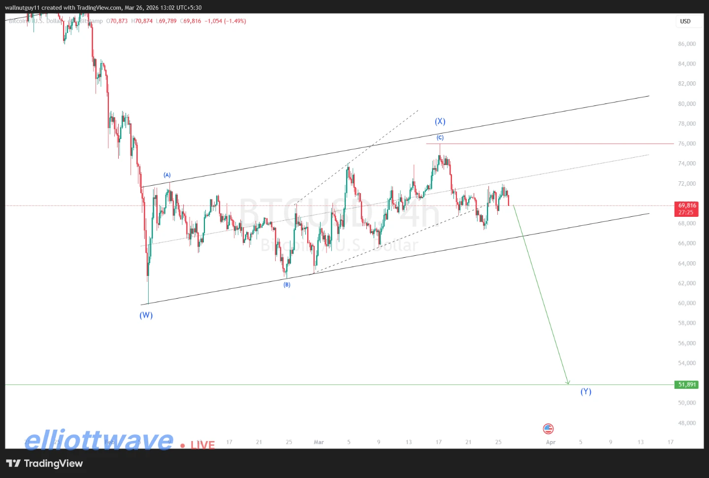 Bitcoin has formed an Ending Diagonal as wave C of wave X. The price is now expected to move downward toward wave Y.